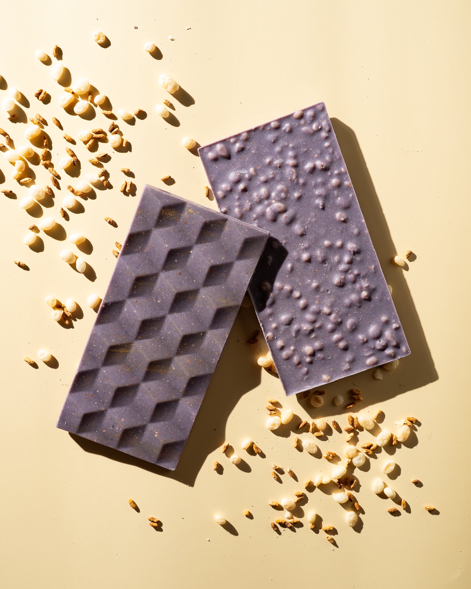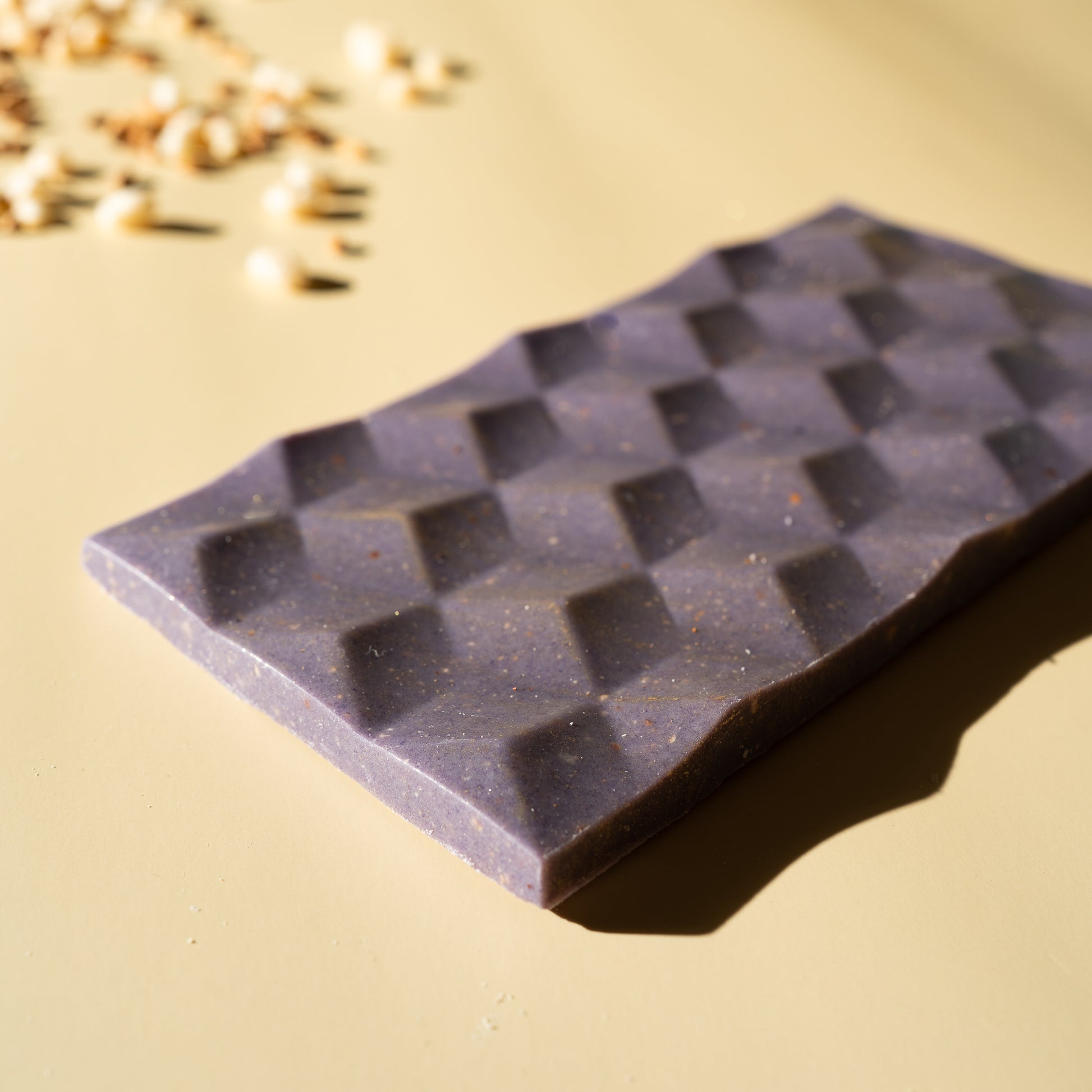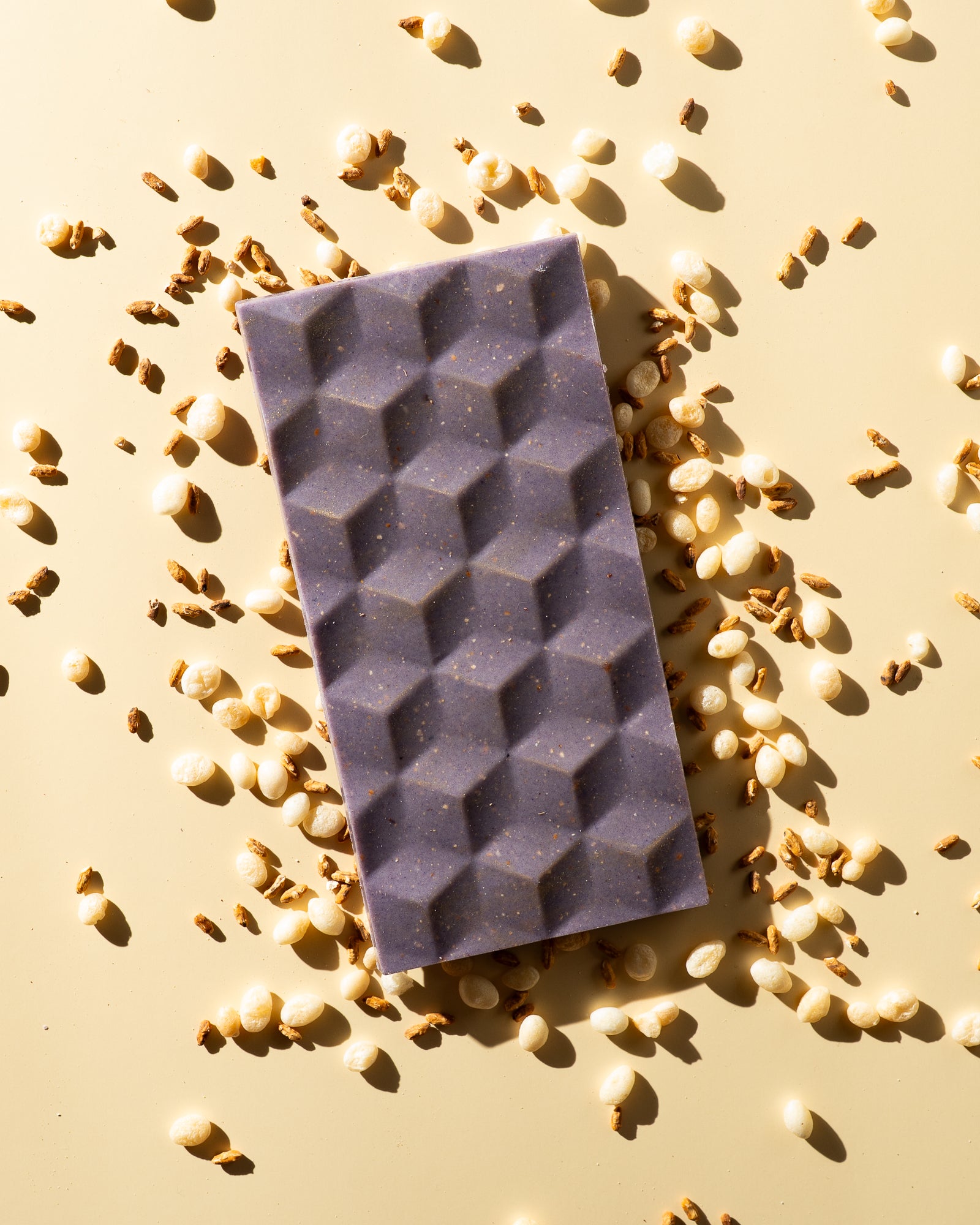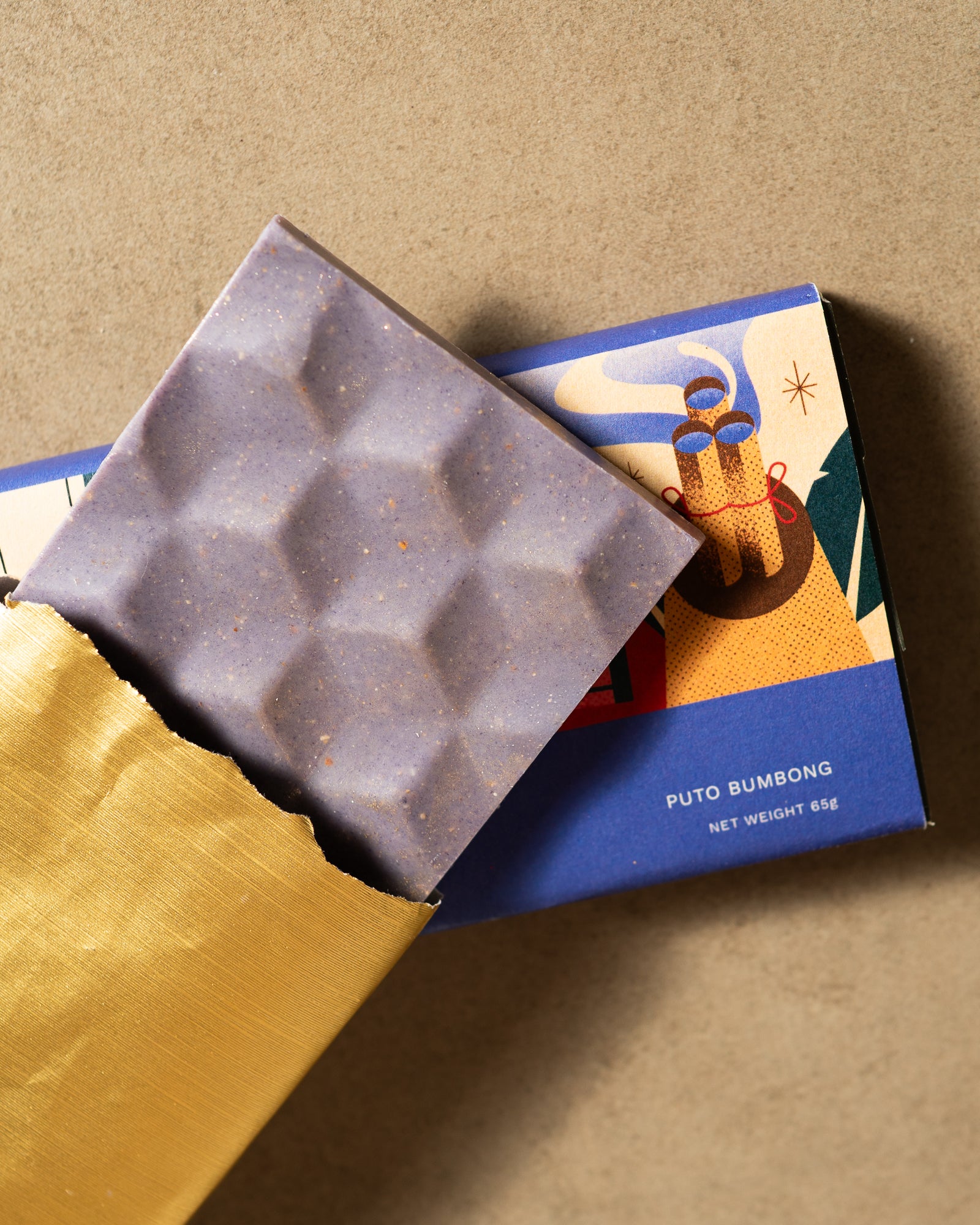 Our Puto Bumbong bar blends smooth ube white chocolate with toasted rice and rice crispies for that familiar chew and crunch, evoking the warmth of Simbang Gabi mornings.